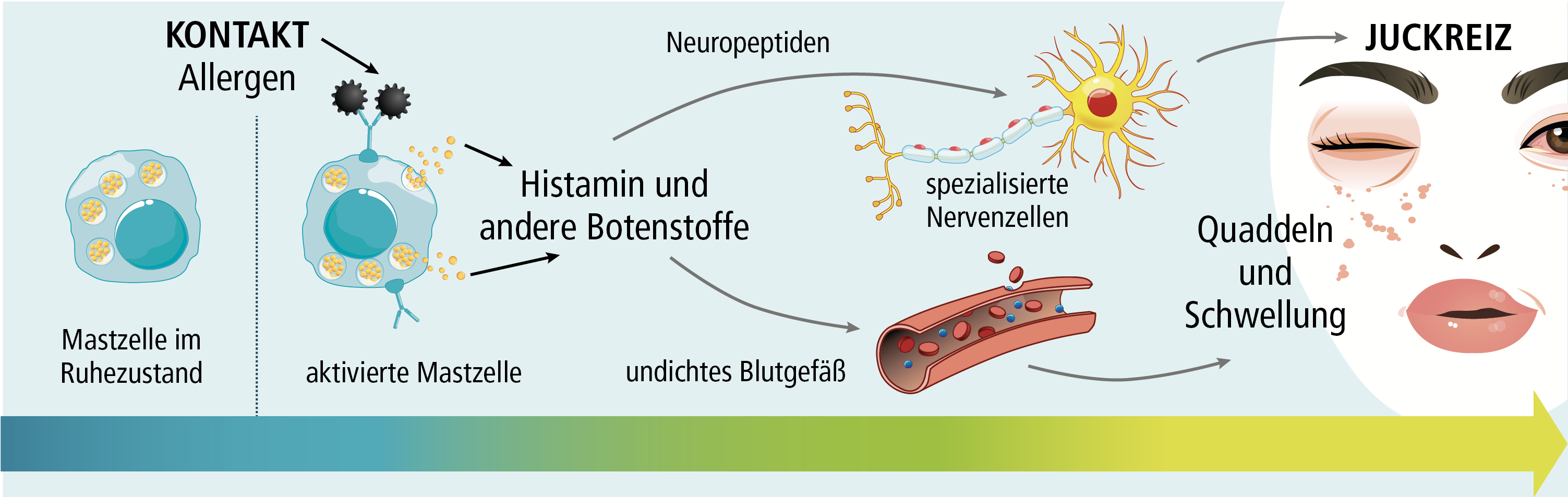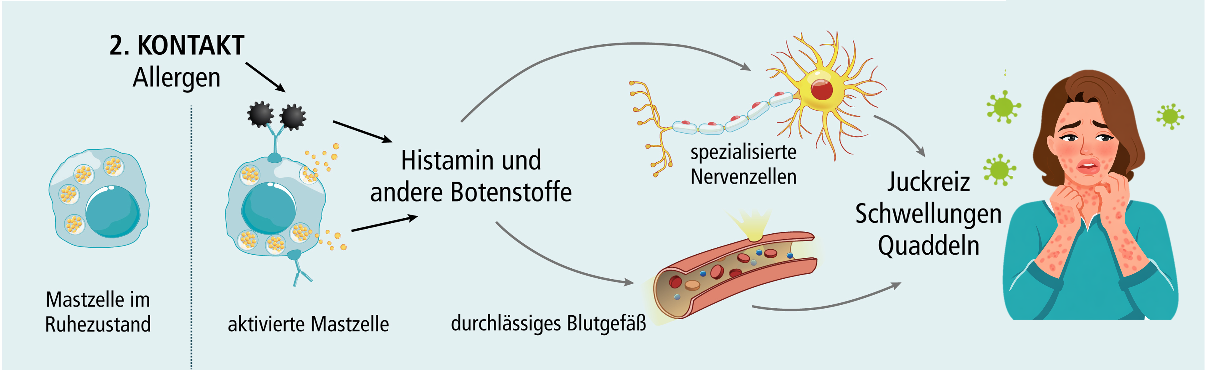 Das freigesetzte Histamin gelangt in das umliegende Gewebe und reizt unter anderem die Nervenfasern in der Haut. Das führt zu starkem Juckreiz am Körper und der Bildung von Quaddeln. Außerdem erweitern sich die Blutgefäße, wodurch Flüssigkeit ins Gewebe austritt – es entstehen die typischen, geröteten und geschwollenen Quaddeln oder Angioödeme, die für die Nesselsucht charakteristisch sind.